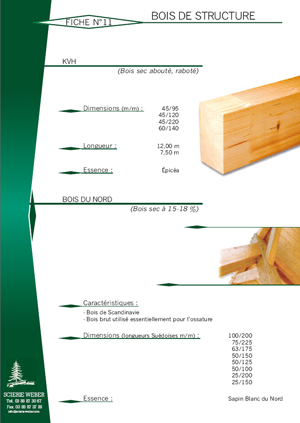 Bois sec abouté, raboté et certifiée "KVH" (association pour le contrôle des constructions en bois) ou Bois du Nord sec à 15-18% (bois brut essentiellement utilisé pour l'ossature).